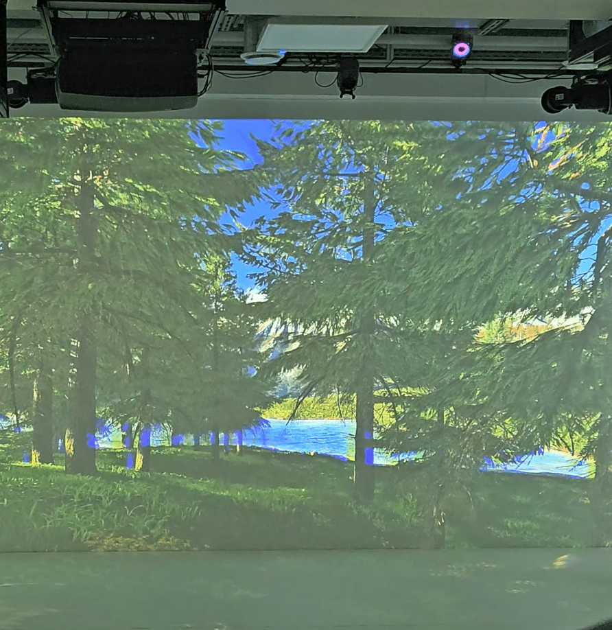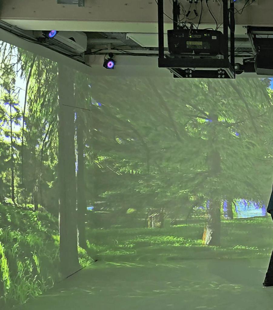 Als letztes begeben wir uns in das „interaktive Kino“ im ersten Stock. Der Raum, zur Hälfte komplett weiß eingekleidet mit Beamern, die von der Decke hängen, hat einen Duft von ätherischen Ölen in der Luft, die mit Fantasie an einen Wald erinnern. Das Kino wird vorgestellt: Es erscheint ein 3D-Film ringsum auf den weißen Leinwänden. Mit einer entsprechenden Brille kann man das mit dem bloßen Auge zunächst nur verschwommen wahrnehmbare Bild dann auch dreidimensional wahrnehmen und sich nun im Raum durch den Wald bewegen. Die Projektion der Welt um einen herum bewegt sich dann beim Gehen hierbei mit. Es erklingt Vogelgezwitscher aus den Lautsprechern; nähert man sich dem Fluss, hört man auch Wasser plätschern. Der Raum soll unter anderem im Rahmen der Stressbewältigungsforschung mit KI bei der Beobachtung helfen, wie sich ein virtueller Waldspaziergang zur Entspannung auswirkt. Durch dieses immersive Erlebnis ist der Raum einem echten Wald zum Verwechseln ähnlich; könnte man die Brille nicht absetzen, würde man sich wahrscheinlich wie Hänsel und Gretel in diesem ca. 40 m² großen Raum einfach verlaufen.